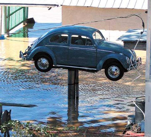 Prized auto sets high and dry on a lift during Marietta flooding. (Parkersburg News)