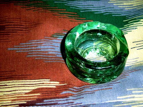 I found this piece of green glass in my yard where they were digging the ditch for a new sewer line. It was dug from 6 feet under the pine tree I've ben bitching about them killing. I washed the mud off and liked the color. If the tree dies, I'll have the green glass to remind me of it. Green glass on bed covering. |