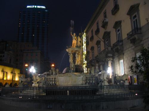 La fontana di Nettuno/ Neptune fountain (XII cent.)by the light of some lamps and a nearby church