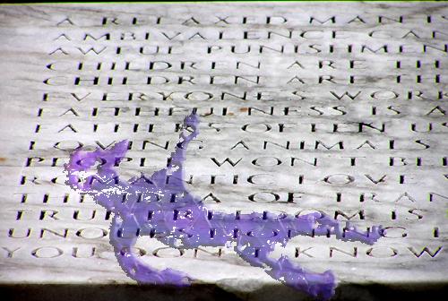 DuckBoy has met the woman of flowing hair and then she disappears like a dream or a daily comic strip. He continues through the caverns lured by the shapes and colors of the stalactites and stalagmites, the sound of dripping and the slight whistle of wind that ocassionally makes resonant deep organ sounds echo along the walls. He is drawn like a dolphin to a tuna net. He enters a strange room where words swirl around him like a philosophy seminar or a mobile poem. Should I stay or should I go? His thoughts clash like cymbals in a Bedouin tent. He stops and tries to take in the possible symbolic meaning as if he were a museum goer looking at Pollock's paintings and wondering what they hell is going on. Letters fall like snowflakes and words form and dissolve,then come together under him and over him as he feels himself fading in and out as if he too is a word or something unreal. He thinks, "I almost have it,it's right there in front of me,behind me,around me..Inside ,outside,upside down..." He feels queasy and closes his eyes. "I'll try another day when I have some dramamine". |