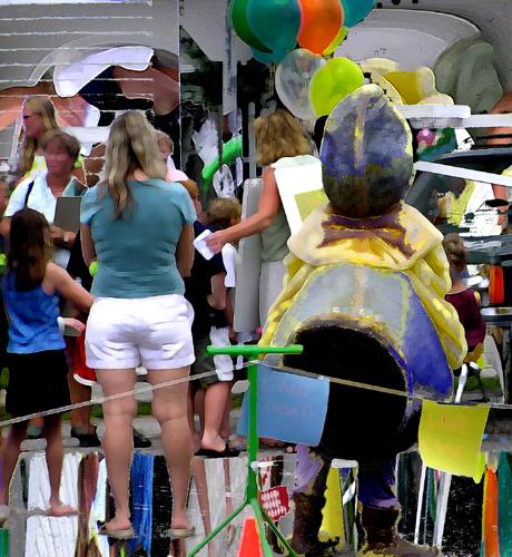 It has come to the attention of many Earthlings that DuckBoy is in a Battle of Epic proportions and so they line up to enlist to become DuckBoy imposters, stand-ins while he takes a break to get a drink or eat some sushi. It is also a great celebration since they are not in harm's way and know they probably never will be. During the Civil War citizens could buy their way out of being conscripted for the Army..it still works that way if not a little more subtly. These folks know that for various reasons they won't be chosen, well except for maybe that one over there.The cry goes up, "Let Duckboy Die for Us!" and the chorus, on the sidelines, sings "Sun warmth on my face I hear you down below moving slow and it's morning take my time this morning No hurry to learn to kill an take the will from unknown faces